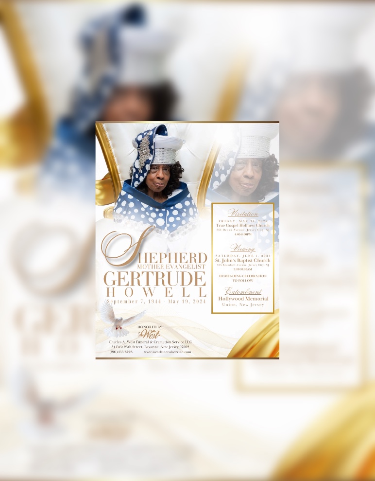 Celebration of Life Services will begin on Friday, May 31, 2024 from The True Gospel Holiness Church 361 Ocean Avenue, JCNJ with a public visitation from 4:00pm to 8:00pm.